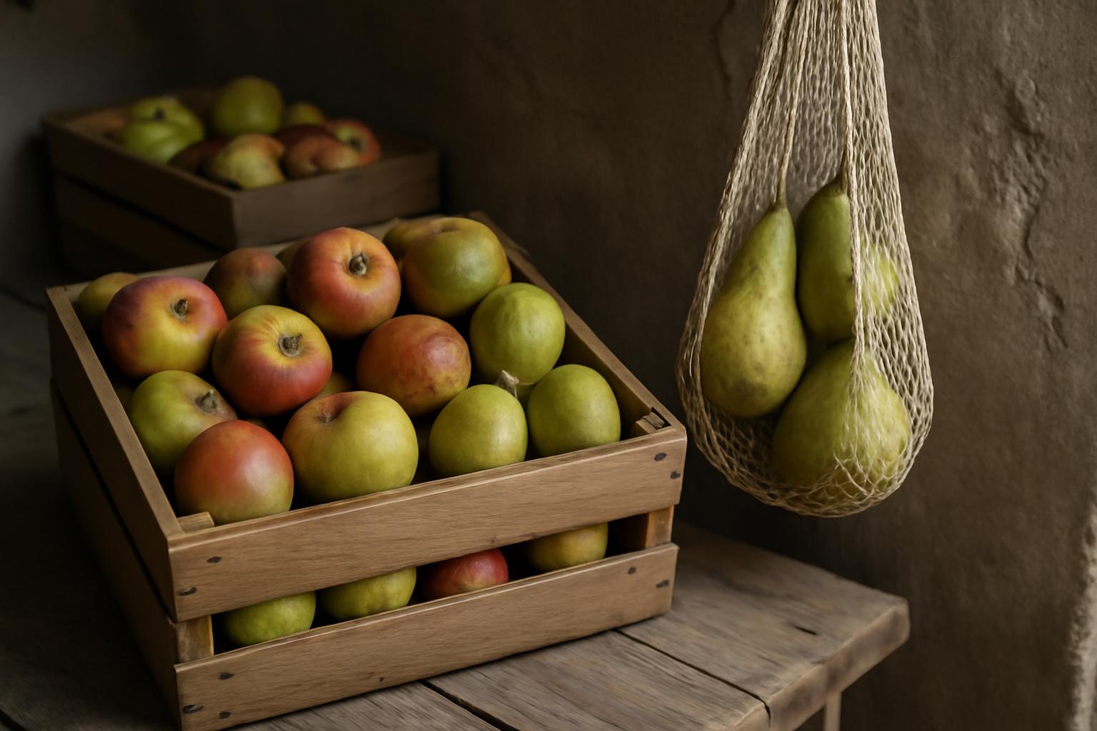 - Ranger les pommes et poires dans des caisses en bois ou en carton, plutôt qu’en plastique. L’air pénètre mieux !