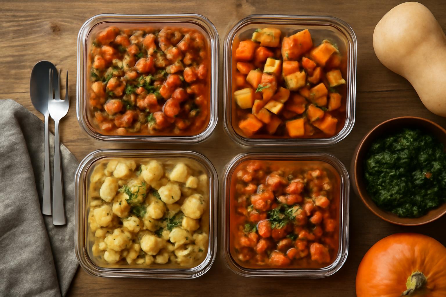 Commencez par une planification simple : 3 à 4 bases (soupe, légumineuses, céréales, légumes rôtis) + 2 protéines + 1 sauce ou bouillon. Choisissez des aliments de saison — légumes racines, courges, choux, poireaux, lentilles — qui tiennent bien la cuisson et offrent des saveurs d’hiver.