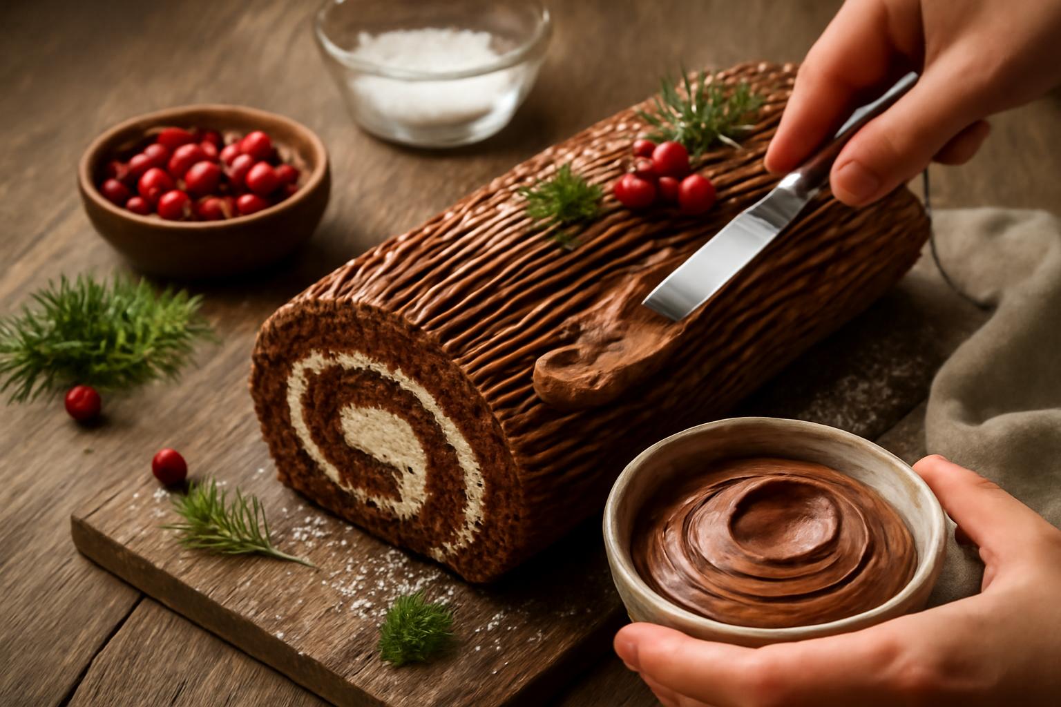 Montage : déroulez délicatement la génoise, étalez la ganache en laissant 2 cm sur le bord, roulez serré sans le torchon et placez sur une grille. Recouvrez le roulé avec le reste de ganache en faisant des stries avec une fourchette pour imiter l’écorce. Réfrigérez 1–2 heures pour raffermir.
