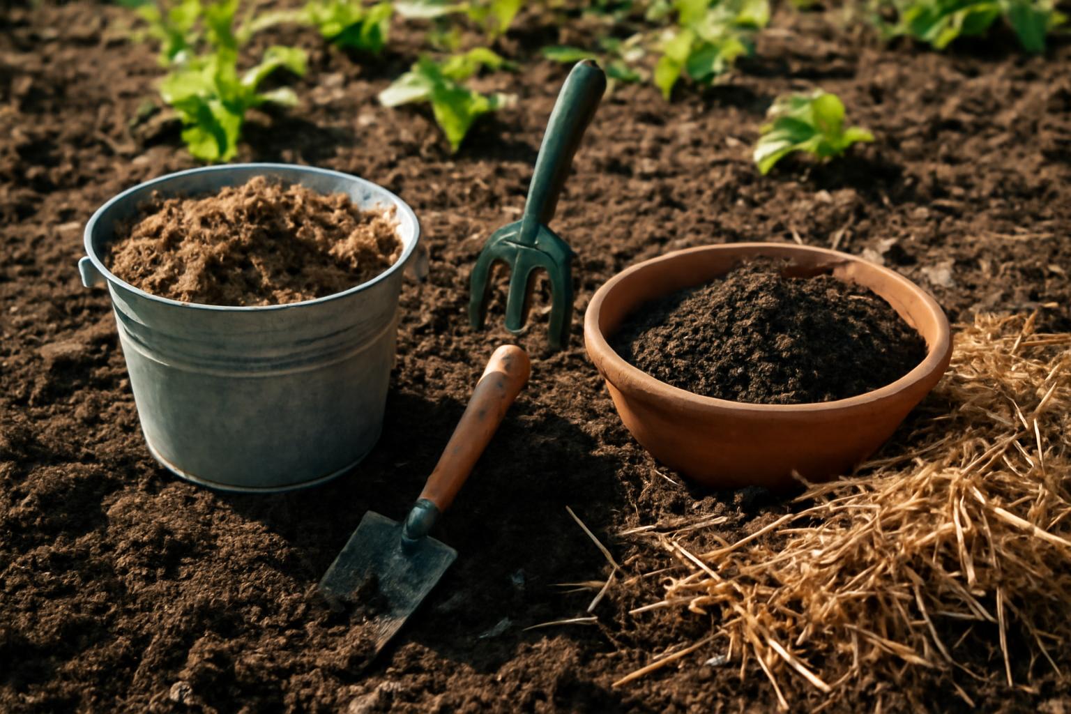 La première et la plus sûre des pratiques : apporter du compost mûr. Étalez 2–4 cm de compost bien décomposé sur vos plates-bandes et griffez légèrement pour l’incorporer sans retourner la terre en profondeur. Le compost améliore la structure, l’hydratation et la fertilité à long terme.