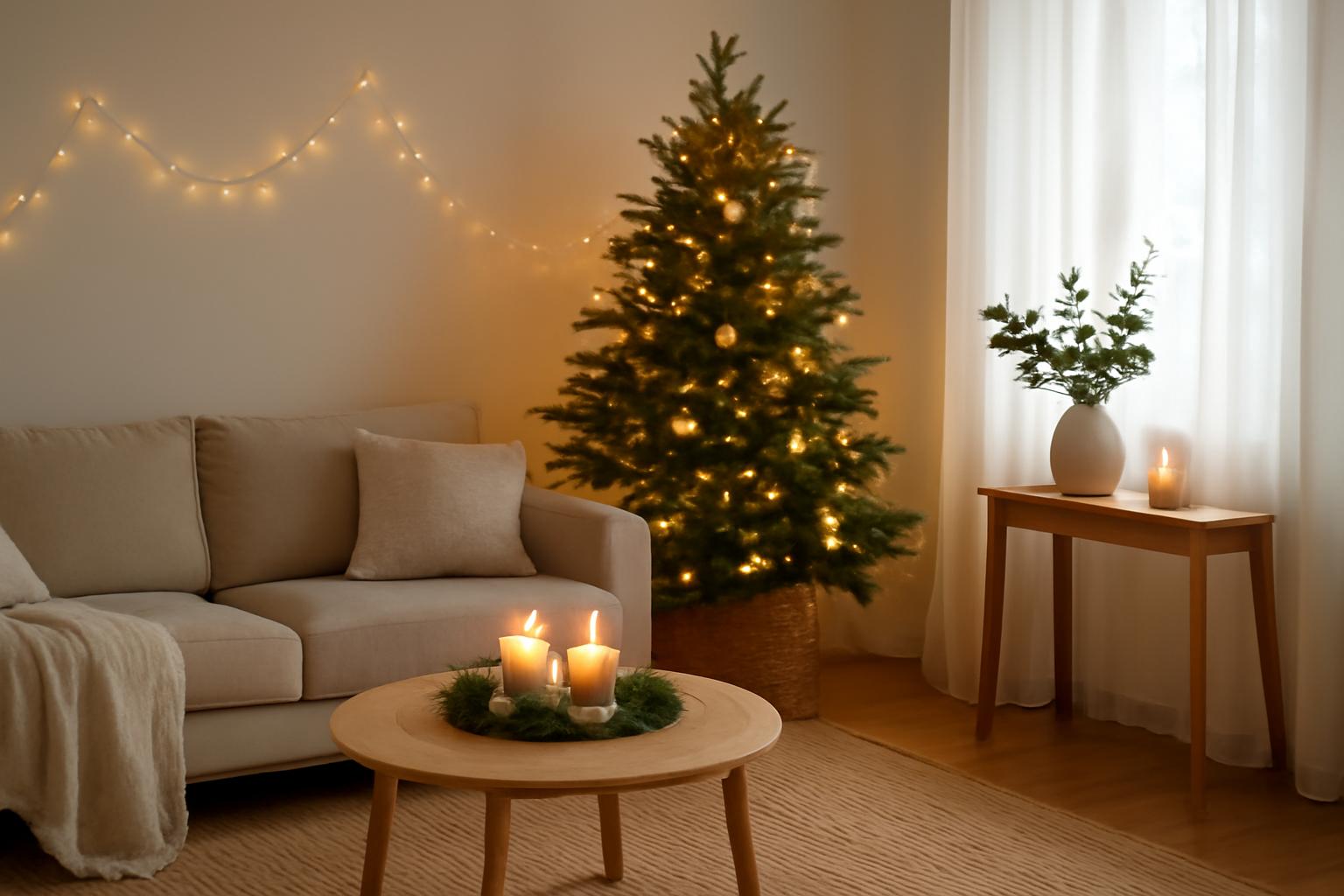 Choisissez un ou deux points focaux — une table centrale, un mur photo, une plante mise en valeur — et décorez-les. Le reste de la pièce doit rester « silencieux » : un fond neutre fait ressortir vos éléments festifs.